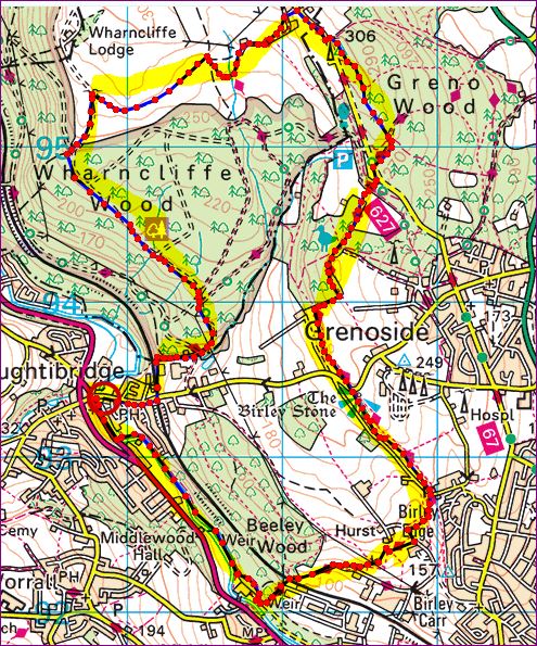 We start our walk today in Oughtibridge crossing the railway bridge with care and in single file as it is quite narrow with no pavement. Turning left immediately after the bridge we head northwards to the woodland boundary and join the Barnsley Boundary Walk path for a short distance until we turn northwest with a gradual climb towards Oughtibridge Hagg. We then continue in a north-westerly direction passing some small waterfalls on our way. We walk through Wharncliffe Wood until we reach the Hobb Stones beside the TV mast. We then head in a north easterly direction across Broom Royd to Hallfield Head Farm. After passing through the farm buildings we turn south east along Woodhead Road to reach the halfway point of our walk at Greno Knoll and Greno Wood. After walking through the woods we cross the Sheffield Country Walk path at which point we head south west towards Prior Royd to Hunter House Farm. We are now well on our way to the highpoint of Whalejaw Hill and the Birley Stone. We continue walking along the ridge which has a quite narrow path which also drops away quite steeply on our right, so care must be taken at this point. After a mile we descend to Royds Row and head west until we reach some steep steps to Rocher Bridge. We then head north west along a very pleasant flat path along the weir to return to Oughtibridge where refreshments are available in several pubs and cafes.