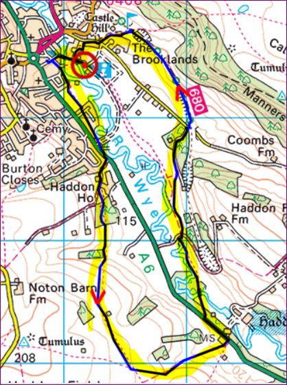 Lunch over and down at the main road we cross near the entrance to Haddon Hall then turn left to walk along the footpath for a while until we reach a small gap in the wall which we mustn’t miss. The track leads us round the perimeter of Haddon Park, close to the river and a muddy and potentially slippery stretch, then gradually up to join the end of the Monsal Trail taking us back to Bakewell.