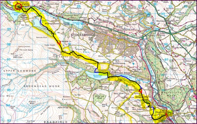The next three miles are all downhill as we pass Broomhead and More Hall Reservoirs after making use of the permissive paths around the waters. We leave the relative low-levels of the reservoirs now and head up to Brightholmlee and the higher ground of Wharncliffe Side. Passing through Glen Howe and having a possible break allowing the atmosphere near the Packhorse Bridge to sink in, we then head towards Onesacre and Coldwell before heading down into Oughtibridge and our awaiting coach and fellow members.