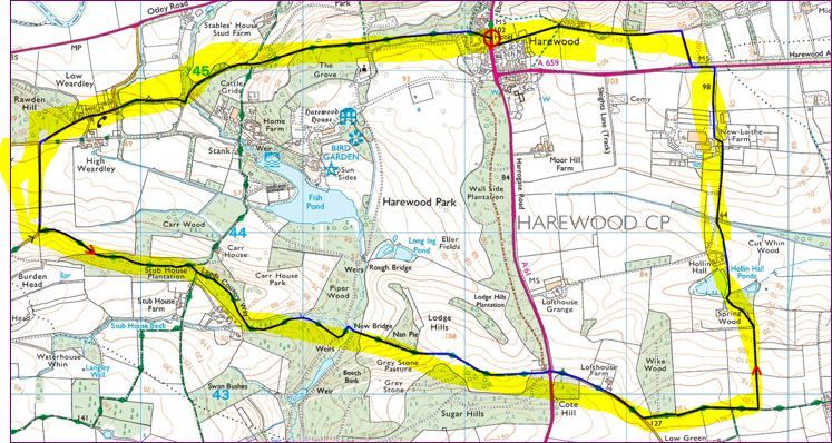 Our walk today starts at the Harewood Arms Hotel on A61 road. We commence by crossing the road so walk North for a short while then tuning left and passing the Muddy Boots cafe on to the Harewood estate. From here we follow a metalled path then through a small wooded area to High Weardley. We then turn South down another small road to turn West to head through Stubb House plantation onto the Leeds Country way. Onward through Piper wood to New Bridge on a path to reach the A61 road again. From here we pass Lofthouse farm before turning left past Wike wood. Then on across 2 fields and going North to Spring wood and Holling Hall. Onwards North passing New Laith farm to the A695 road. We walk a short way on the road before turning right to reach a path which takes us back to Harewood. Be warned, because of the weather we have been having recently, some areas of the walk could be muddy, therefore a stick could be very helpful today.